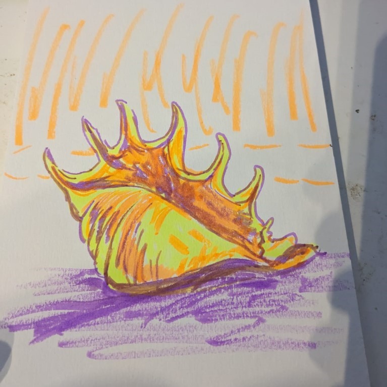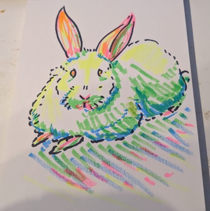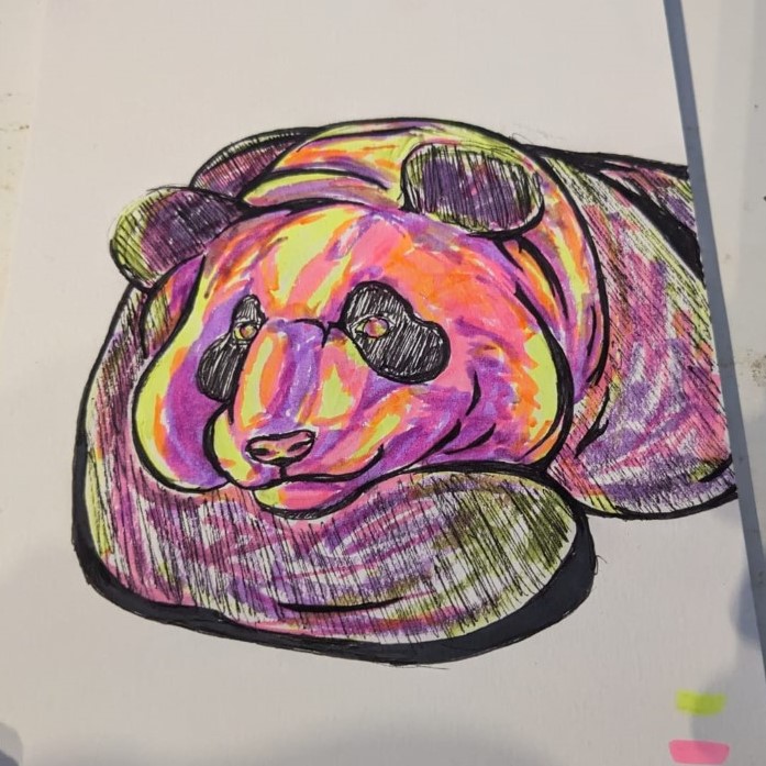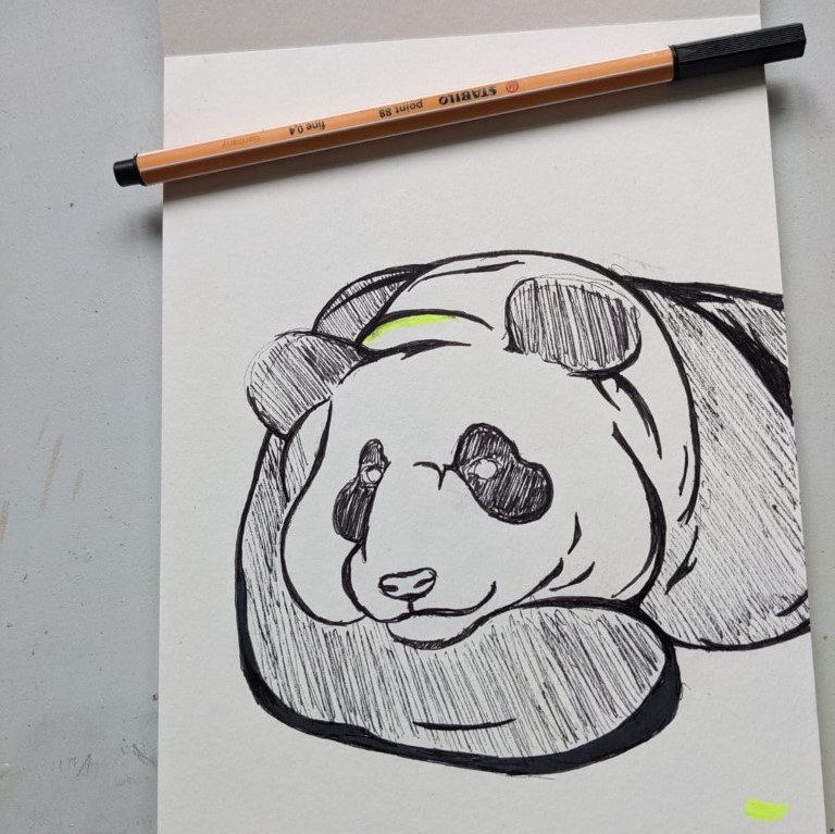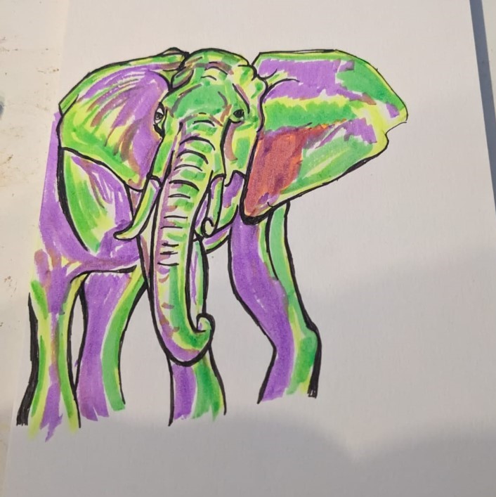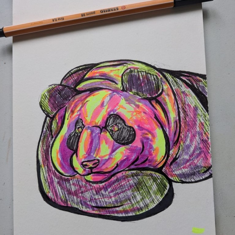 Die Tiere werden mit schwarzer Tusch oder Fineliner Stiften gezeichnet und dann mit Markern schattiert, wobei die verschiedenen Markenfarben als unterschiedliche Helligkeitsstufen genutzt werden.