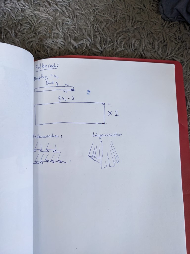 Die Schnitte der Röcke waren ausgesucht; nun ging es daran, auszumessen und das Ganze auf ein großes Papier zu übertragen und auszuschneiden. Hier war räumliches Denken gefragt.